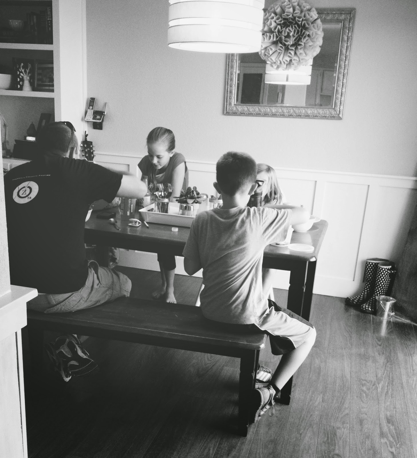 (Tonight's family dinner. P.S. - We do own chairs, haha! Most of them were being used to make a fort in the living room, so some of our children chose to stand at the dinner table.)